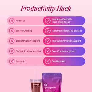 This square ad template is built for a functional drink mix or supplement that promises clean energy and sharper focus. The design uses a soft blush-pink background with a high-contrast magenta-to-purple gradient in pill-shaped rows, creating an instant “problem vs. solution” scan. Each line pairs a red X on the left (pain points like no focus, energy crashes, coffee jitters, busy mind) with a checkmark on the right (benefits like sustained energy and zen-like calm). The serif headline “Productivity Hack” adds a premium, lifestyle feel while the structured checklist keeps the message easy to absorb in-feed. Strategically, this creative fits top-of-funnel awareness for an “unaware” audience: it hooks with curiosity and transformation, framing common daily struggles and offering a simple upgrade. The product pack and drink photo at the bottom anchor the claims to a tangible routine. Brands can customize by swapping the benefit rows, adjusting gradient colors to match brand identity, and replacing the bottom product shot with their sachets, tub, or ready-to-drink bottle while keeping the left/right contrast intact.