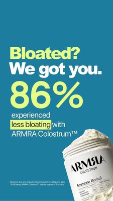 This template works by pairing a high-intent symptom hook (“Bloated?”) with a single, dominant proof point (“86%”)—a classic curiosity + trust-signal combination. For an unaware audience, leading with the problem reduces friction: viewers don’t need prior knowledge of colostrum to feel seen. The oversized statistic provides instant credibility and makes the benefit memorable, while the small clinical/third‑party footnote adds legitimacy without cluttering the main message. As a top-of-funnel awareness creative, it’s optimized for fast comprehension in Stories: one question, one number, one outcome, then the product packshot to anchor attribution. The clean, high-contrast color system improves readability on mobile and aligns with best practices for compliant, claim-led supplement advertising when supported by substantiation.