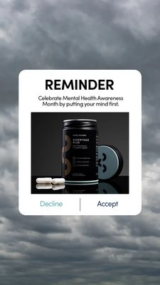 This 9:16 Story template promotes a nootropic supplement for focus and cognitive support using a clean “phone reminder” metaphor that instantly frames the product as a daily habit. A soft, cloudy gray full-bleed background creates a calm, mental-wellness context, while a large white rounded card centers attention like a notification pop-up. The headline “REMINDER” in bold, condensed sans-serif delivers clarity and authority, followed by supportive copy about Mental Health Awareness Month to add meaning and relevance. The product packshot sits in a dark, premium studio frame: a matte-black bottle with minimal labeling, a matching lid, and a few white capsules—classic credibility cues for supplements. At the bottom, “Decline | Accept” mimics a system prompt, sparking curiosity and driving micro-commitment toward the “Accept” action. Best for top-of-funnel, solution-aware audiences who already believe supplements can help, but need a trustworthy nudge. Swap the awareness line for your brand benefit, update the bottle label and accent color, and keep the notification layout to maintain high skim readability in Stories.