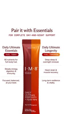 This creative works because it leverages convenience and aspiration without resorting to hype. The centered hero stick pack makes the product instantly recognizable for product-aware viewers, while the symmetrical “day” vs “night” columns reduce cognitive load and turn a multi-benefit formula into a simple routine. That clarity is ideal for mid-funnel consideration: people comparing options want a quick, credible summary of outcomes (energy/digestion/immunity versus sleep/recovery/resilience). The clean white space and restrained color palette signal quality and trust, supporting an authoritative tone. The small badge-like chips act as micro-CTAs (“today/tomorrow”), nudging commitment while keeping the message focused on benefits rather than discounts—an effective best practice for premium supplement brands.
