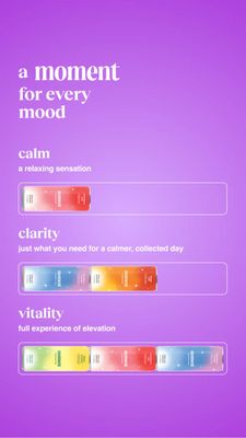 This Story-format template promotes a functional supplement drink line presented as a “moment for every mood.” A soft purple-to-lilac gradient background sets a calming, modern feel while high-contrast white serif typography delivers an editorial, premium look. The layout is stacked in three horizontal product trays: “calm,” “clarity,” and “vitality,” each paired with short benefit copy and color-coded can/pack shots (red, blue, yellow/green) shown in clean, rounded rectangles. This structure makes the variety pack concept instantly understandable at a glance and invites comparison without overwhelming the viewer. Strategically, it’s built for top-of-funnel awareness: it sparks curiosity through mood-based naming, taps aspiration with lifestyle outcomes (relaxation, collected day, elevation), and leverages novelty by showcasing multiple flavors/benefits in one creative. It works well for wellness shoppers who are browsing and want a simple “choose your feeling” entry point. Customize by swapping mood names, updating benefit lines, and replacing the product renders while keeping the three-tier progression for easy scanning.