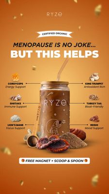 This 9:16 Story template promotes a functional mushroom blend drink positioned as supportive during menopause. The design uses a warm amber-to-gold gradient with floating ingredient particles to create a “natural potency” atmosphere. A bold, two-line headline (“Menopause is no joke… BUT THIS HELPS”) sits above a centered product shot: an iced drink in a branded jar with a straw, surrounded by mushrooms and powder to signal real ingredients. Ingredient callouts on both sides list specific mushrooms and benefits (energy, immune, focus, antioxidants, bloat-friendly, mood), building credibility for a solution-aware audience in the consideration stage. A “Certified Organic” ribbon adds trust, while the bottom banner offer (“FREE magnet + scoop & spoon”) provides an incentive that reduces friction without heavy discounting. The layout is easy to customize: swap the headline to match your core symptom, replace the callouts with your formula’s actives, and update the freebie/bonus for your brand. It’s ideal for supplement brands wanting a clean, informative, benefit-led Story creative.