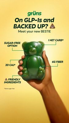 This Story-format template promotes a fiber-forward gummy supplement positioned as a light, digestion-friendly companion for people using GLP‑1s. The design is a bold handheld product shot: a glossy green gummy bear centered in-frame, held up against a clean warm yellow background. Minimalist callout lines point to key benefits ("sugar-free option," "1 net carb," "20 cal," "6g fiber"), creating a quick “scan and understand” layout. The headline uses a provocative, curiosity-driven hook (“On GLP‑1s and backed up?”) with a playful emoji, then softens into friendly reassurance (“Meet your new BESTIE”), matching top-of-funnel awareness where viewers aren’t actively shopping yet. High contrast dark-green typography on the bright background ensures readability on mobile. This creative works because it makes a potentially awkward problem approachable, frames the product as a routine-friendly fix, and anchors claims with specific numbers. Customize by swapping the gummy color/flavor, replacing callouts with your exact macros or certifications, and adapting the headline for other routine pain points (bloating, cravings, “sweet tooth”).