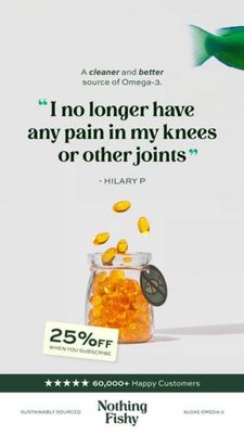 This creative is optimized for bottom-of-funnel, product-aware shoppers comparing omega‑3 options. The oversized testimonial operates as immediate social proof, reducing skepticism around a health benefit (joint comfort) by presenting a first-person outcome. The “60,000+ Happy Customers” with star icons adds crowd validation, while the clean, minimalist background signals purity and quality—important for supplements. The subscription discount card anchors value and gives a concrete reason to act now without relying on loud urgency tactics. Finally, “cleaner” and “algae omega‑3” cues differentiate the product for buyers concerned about fishy aftertaste, contaminants, or sustainability. The result follows best practices for mobile: one dominant claim, one product visual, one offer, and one trust footer—high clarity, low cognitive load.