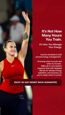 This template wins by combining aspiration and authority at the very first glance: the full-height athlete image signals real-world performance, making the claim feel earned rather than hyped. The headline reframes a common belief (“more hours”) into a smarter insight (“manage energy”), a classic awareness-stage pattern that creates curiosity for viewers who aren’t actively shopping. The right-side copy then bridges that curiosity into a simple benefit narrative (steady energy, hydration, recovery), while the bottom guarantee banner adds risk reversal to keep momentum without requiring a hard sell. In TOF for an unaware audience, this structure is effective because it educates lightly, motivates strongly, and offers an easy psychological out (“money back”) that reduces the barrier to trying a supplement brand for the first time.