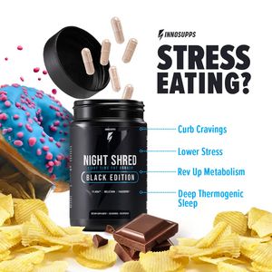 This square supplement ad template promotes a nighttime weight-management capsule formula designed to address stress eating and cravings. The layout is product-centered: a matte-black bottle sits in t...