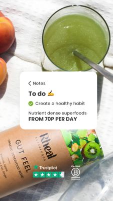 This 9:16 Story template is built for promoting a superfoods powder or daily greens blend, positioned as an easy, affordable wellness habit. The background uses a sunlit, real-life tabletop scene: a top-down glass of green smoothie with a spoon, fresh fruit at the edge, and a branded pouch placed diagonally for instant product recognition. A rounded “Notes” card overlays the photo, mimicking a phone to‑do list—perfect for framing the purchase as a simple daily action. Typography is clean and modern, with a bold price hook (“FROM 70P PER DAY”) that anchors attention while keeping the message lightweight. Trust cues sit near the product: a Trustpilot star strip and a B‑Corp style badge reinforce credibility without adding clutter. This makes the creative ideal for top‑of‑funnel audiences who aren’t actively shopping supplements yet, but respond to lifestyle aspiration, freshness, and low-friction entry pricing. Brands can swap the pouch, flavor callouts, and badges while keeping the bright, healthy green palette that signals natural nutrition and routine-building.
