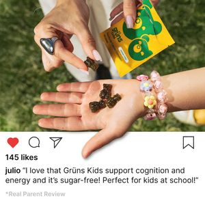 This template works by borrowing the visual language of an Instagram post, which lowers “ad resistance” and frames the message as a peer recommendation. The lifestyle close-up of gummies being poured into a child’s hand communicates convenience and daily routine fit—key for parents evaluating kids supplements. Social proof is explicit through the quoted parent review and like count, while the “sugar-free” callout reduces a common objection around kids’ gummies. In the MOF consideration stage for solution-aware buyers, the creative prioritizes reassurance (real parent voice) and a simple benefit stack (cognition + energy) rather than deep education. It follows best practices by keeping the product pack highly visible, using a clean white text area for readability, and adding a small authenticity note (“Real Parent Review”) to support trust and compliance-oriented messaging.
