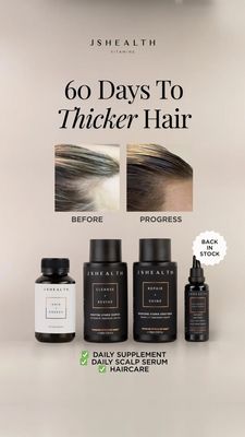 This template converts solution-aware shoppers by pairing a specific timeframe (“60 Days”) with visual transformation proof (“Before” vs “Progress”). That combination reduces perceived risk and anchors expectations—key for hair-thinning audiences who have often tried multiple products. The premium serif headline and minimal beige backdrop build trust and legitimacy, while the lineup of products communicates a complete regimen rather than a single “miracle” item. The checklist reframes the purchase as an easy daily habit, lowering cognitive load and increasing perceived attainability. With a subtle “Back in Stock” badge, it also leverages scarcity/availability without discounting, making it well suited for mid‑funnel consideration and retargeting where credibility and clarity drive the next click.