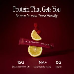 The template is built for top-of-funnel, unaware viewers: it explains the product format (a single-serve stick) visually, before asking for any commitment. Convenience is the primary trigger—“No prep. No mess. Travel friendly.”—removing friction that often stops protein purchases. Health-focus and credibility are reinforced with three scannable proof points (15g protein, electrolyte blend, 0g sugar), a best-practice structure for mobile feeds where users decide in seconds. The premium dark gradient and editorial typography elevate perceived quality, supporting higher pricing and “clean” positioning. By pairing appetizing fruit with minimalist claims, the ad balances taste appeal with functional benefits, making it effective for audiences comparing macros and looking for an easy, modern alternative to traditional protein powders.