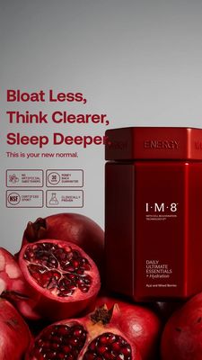 This 9:16 Story template is built for a premium hydration and daily wellness supplement, using a bold benefit-led headline to hook an unaware audience fast. The design pairs a clean light-gray background with deep berry reds, creating high contrast that immediately spotlights the product jar. A large, left-aligned serif headline (“Bloat Less, Think Clearer, Sleep Deeper”) drives curiosity and aspiration, while the small subline (“This is your new normal.”) softens the promise into a lifestyle outcome. Four minimalist icon badges (no artificial sweeteners, 30‑day money back guarantee, NSF certified sport, clinically proven) add instant credibility without clutter. The bottom layer of pomegranate imagery signals berry flavor and naturalness, reinforcing the hydration concept with a sensory cue. This creative works well at top-of-funnel because it sells the feeling and daily routine first, then backs it up with trust signals. Customize by swapping the fruit set to your flavor, replacing badges with your certifications, and adjusting the jar color to match your brand palette while keeping the left text column intact for readability in Stories.