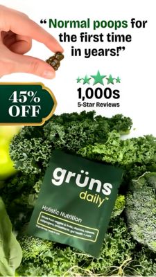 This creative is optimized for BOF decision-making: it assumes the viewer is already product-aware and answers the two final objections—“Will it work for me?” and “Is it worth it right now?”. The quoted, specific digestive outcome acts like a mini-testimonial, delivering high relevance for people experiencing discomfort and seeking regularity. Direct language increases believability versus vague wellness claims. Social proof is reinforced twice (star icons + “1,000s 5‑Star Reviews”), reducing risk and leveraging herd behavior. The prominent “45% OFF” badge adds a value trigger that can tip comparisons in your favor, especially for subscription or first-order offers. Best-practice elements—clear hierarchy, high contrast, and a category-defining greens image—help users understand the product in under a second and move them toward purchase.