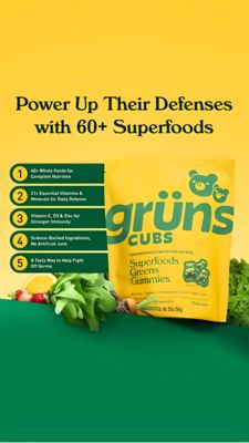 This 9:16 Story template is built for a kids-focused greens superfood gummy supplement, using a bold promise-led headline (“Power Up Their Defenses with 60+ Superfoods”) to immediately frame the benef...