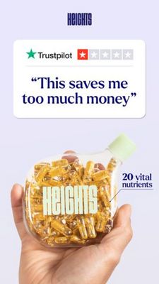 This template works because it compresses mid-funnel decision drivers into a fast-scanning Story. The Trustpilot-style stars and testimonial card deliver social proof and trust at the top of the frame—exactly where thumb-stoppers must win attention. The quote is framed as a value-savings claim, which reduces price resistance by positioning the supplement as a smarter cost-per-day choice rather than an extra expense. For solution-aware audiences, the product close-up confirms “this is a real capsule supplement,” while the concise “20 vital nutrients” callout adds feature justification without turning the ad into a dense label. Overall, it follows best practices: one dominant message, one supporting proof point, and a clear product visual, making it strong for retargeting and consideration campaigns.