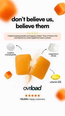 This creative works because it flips the persuasion source: the headline prompts skepticism, then immediately redirects trust to real customers—classic social proof for a solution-aware audience. The 5-star rating and “125,000+ happy customers” add both qualitative and quantitative credibility, reducing perceived risk in the consideration stage. Convenience is positioned as the key benefit (“no scooping powders, no shaker”), a high-impact trigger for busy supplement users who already want the outcome but dislike the routine friction. Ingredient callouts keep transparency front-and-center, signaling formulation legitimacy without forcing long copy. The clean white space and high-contrast typography improve mobile scanability in Stories, while the oversized gummies create strong product memory and immediate category recognition.