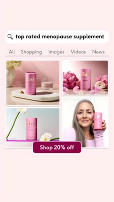 This Story-format template promotes a menopause dietary supplement using a “search-to-purchase” concept that feels like a real customer journey. The top section mimics a mobile search bar reading “top rated menopause supplement,” instantly signaling social proof and high intent. Below it, a clean 2x2 grid showcases multiple product contexts: studio product shots with soft flowers and glassware for a premium, wellness feel, plus a mature model holding the bottle to add relatability and reassurance. The color palette is blush pinks and creamy neutrals, supported by rounded cards and minimalist typography that keeps the design modern and trustworthy. A bold magenta CTA pill (“Shop 20% off”) anchors the bottom, turning interest into action with a clear discount trigger—perfect for BOF decision audiences already product-aware. Brands can easily swap the bottle, adjust the search phrase to match key benefits (hot flashes, sleep, mood), and replace the discount to fit their offer strategy while keeping the elegant, high-converting structure intact.
