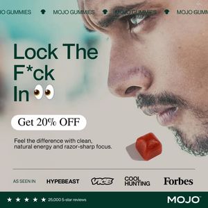 This square ad template is built for an energy and mental-focus gummy supplement (like “Mojo Gummies”) and is designed to convert product-aware shoppers at the decision stage. The layout is lifestyle-led: a tight, dramatic close-up of a focused male face dominates the right side, while the left side carries a bold, provocative headline (“Lock The F*ck In”) for instant scroll-stopping impact. A clean pill-shaped badge highlights the offer (“Get 20% OFF”), and supporting copy reinforces benefits—“clean, natural energy” and “razor-sharp focus”—without overwhelming the design. Social proof is layered in two strong signals: a press row (“As seen in” with recognizable publication logos) and a review line (“25,000 5-star reviews”) in the bottom bar. The deep green footer with a logo lockup adds brand authority, while the small gummy cube product shot provides a clear product cue. Customize by swapping the headline to match your brand voice, replacing the press logos with your own placements, and updating the discount badge for subscriptions, bundles, or limited drops.