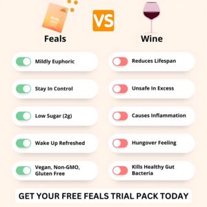 This square comparison ad template is designed for a single‑serve dietary supplement positioned as a healthier alternative to wine. The layout is a clean “VS” face‑off: product pack on the left (Feals...