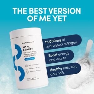 This creative works because it blends aspiration with verification. The top headline signals identity-based transformation (“best version of me”), a strong motivator for beauty-supplement buyers, while the first callout anchors the promise with a concrete, comparable number (15,000mg). That combination satisfies a product-aware audience in the consideration stage: they don’t need education on what collagen is, they need reasons to choose this specific tub. The three stacked, rounded benefit bars create a fast, mobile-friendly scan path, reducing cognitive load. The scoop-and-powder visual adds sensory realism and reinforces “this is a mixable powder,” addressing format questions before clicking. Overall, it follows best practices for static feed ads: dominant product shot, clear hierarchy, high-contrast typography, and claim segmentation that supports quick comparison shopping.