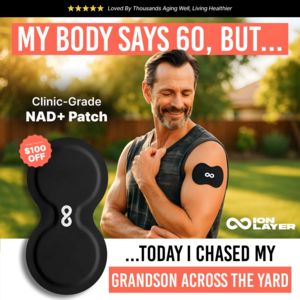 This creative wins on curiosity + aspiration: the unfinished line (“My body says 60, but…”) forces a mental gap that users want to close, while the payoff (“chased my grandson”) delivers an emotionally positive, relatable benefit. It’s ideal for TOF awareness with an “unaware” audience because it sells the outcome (feeling younger and more capable) before asking the viewer to understand NAD+ science. Trust is layered through best-practice cues—star rating, “Loved by Thousands,” and “Clinic‑Grade”—which reduce skepticism around supplements. The visible on-arm patch demonstrates the delivery format instantly, lowering friction and supporting quick comprehension on fast-scrolling feeds. The discount badge adds a conversion bridge for viewers who are intrigued and price-sensitive, turning attention into a first click or purchase intent.