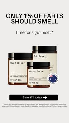 This 9:16 Story ad template promotes a digestive-support supplement bundle aimed at bloating, gas, and gut discomfort. The design is intentionally clean and clinical: an off‑white background, bold black all‑caps headline, and a simple secondary question (“Time for a gut reset?”) that frames the product as an easy next step. Three amber supplement jars are stacked in the lower half to signal “bundle value,” while a circular “Made in Australia” badge adds credibility. The CTA is a strong black pill-shaped button with a clear savings hook (“Save $70 today”), pushing consideration-stage users toward purchase without needing a long explanation. This creative works because the provocative headline sparks curiosity and lightly uses shock humor to stop the scroll, then immediately pivots to a practical solution and a concrete financial incentive. Brands can customize by swapping the bundle names, adjusting the savings amount, and replacing the trust badge with certifications (GMP, vegan, third‑party tested) while keeping the minimalist hierarchy that makes the offer easy to scan in Stories placement.