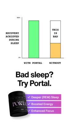 This creative wins by combining authority and transformation in a format built for quick mobile comprehension. The chart at the top functions as a “proof cue”: even without reading every word, viewers understand that results are higher “with Portal” and subpar “without,” triggering curiosity and a fear of missing out on better recovery. The blunt label (“THIS IS BAD”) adds pattern interruption and a decisive stance, which is effective for solution-aware audiences comparing options. In a MOF consideration stage, the design balances evidence (infographic) with clarity (problem/solution headline) and closes with concrete, scannable benefits (REM sleep, energy, focus) that map to common pain points. The clean white space and black type enhance credibility, while the bright green and purple accents signal performance and make the key elements thumb-stopping in Story placements.