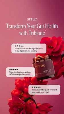 This 9:16 Story template is built for a gut-health capsule supplement, spotlighting a “Tribiotic” style formula (pre-, pro- and postbiotic positioning). The design uses a soft pink-to-plum gradient background with dramatic red florals framing a tilted amber supplement jar, creating a premium, wellness-meets-beauty look. A refined serif headline sits high and centered for instant clarity, while three rounded testimonial cards with star ratings cascade down the layout, turning the message into scannable proof. Strategically, this creative leans on trust and social proof—star ratings plus specific outcome language (bloating, digestion regularity, balance). That makes it ideal for mid‑funnel consideration and solution‑aware audiences who already believe in probiotics and are comparing options. The florals and warm palette add aspiration and brand desirability without distracting from the claims. Customize by swapping the jar shot, updating the headline to your key benefit, and replacing each testimonial with verified reviews (keeping one short, one detailed, one “punchy” line).