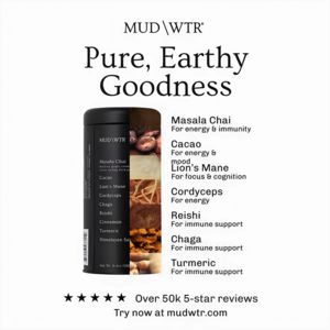 This square supplement ad template is built for a functional mushroom powder drink mix, using a clean, editorial layout that feels premium and trustworthy. A bold serif headline (“Pure, Earthy Goodness”) anchors the top, while the center-left features a sleek black canister product shot paired with a vertical ingredient photo strip that signals natural sourcing. On the right, a structured benefits list connects each ingredient (Masala Chai, Cacao, Lion’s Mane, Cordyceps, Reishi, Chaga, Turmeric) to a specific outcome like energy, focus, mood, and immune support—perfect for solution-aware shoppers comparing options. The bottom row adds rating stars and “Over 50k 5-star reviews,” leveraging social proof to reduce perceived risk in the consideration stage. With high contrast black-on-white typography, this template stays scannable on mobile while communicating a “clean label” wellness vibe. Customize by swapping the ingredient list to match your formula, updating the claim language to compliant benefit phrasing, and replacing the URL line with your CTA and offer.