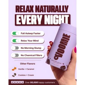 This template works because it combines comfort cues with credibility cues—ideal for product-aware audiences in the consideration (MOF) stage. The soft lavender palette and “Every Night” promise frame the product as a repeatable bedtime ritual, tapping into the wellness-routine trigger. The toggle-style checklist simplifies evaluation: shoppers can scan benefits and clean-label claims in seconds, reducing cognitive load and increasing perceived transparency. Flavor options add a ‘treat’ association that lowers resistance versus pills or harsh sleep aids, while the in-hand product shot adds realism and helps viewers imagine usage. Finally, the star bar and “Over 50,000 happy customers” line provides a strong trust signal, addressing hesitation around efficacy and safety—two common blockers in sleep supplements. Overall, it follows best practices: one dominant promise, scannable proof points, and social validation close to the decision cue.