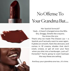 Questo template quadrato è pensato per promuovere un rossetto “di nuova generazione”, presentandolo come l’evoluzione naturale rispetto alle formule vecchio stile: secche, trascinanti e poco confortevoli. Il design è un split pulito e molto editoriale: a sinistra tre immagini in colonna (bullet del rossetto in primo piano, swatch cremoso del colore e una modella mentre lo applica), a destra un grande blocco bianco con tipografia serif elegante. L’effetto richiama le pagine beauty di una rivista e comunica subito qualità premium. L’headline ironica (“No offense…”) attiva curiosità e un pizzico di provocazione, poi porta l’utente nella fase di consideration con argomenti concreti: scorrevolezza, sensazione “skincare”, gamma di shade e resa senza crepe o sbavature. È ideale per un pubblico già informato sul prodotto, che confronta formule e cerca motivi credibili per cambiare. Personalizzalo sostituendo le foto del colore hero, adattando il tono del claim e riscrivendo i benefit (idratazione, finish matte/satinato) mantenendo la stessa gerarchia visiva.