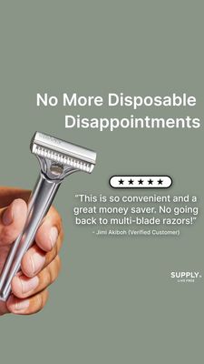Questo template in formato 9:16 Story è pensato per promuovere un rasoio di sicurezza riutilizzabile come alternativa concreta ai rasoi usa e getta con cartucce multi‑lama. Il layout è pulito e molto leggibile su mobile: sfondo tinta unita verde salvia/grigio, headline bianca grande in alto (“No More Disposable Disappointments”) e, a sinistra, un primo piano in mano del rasoio che mette in evidenza metallo e qualità costruttiva. A destra, il bollino con 5 stelle e la citazione di un “verified customer” forniscono riprova sociale immediata e abbassano le obiezioni, rendendolo perfetto per la fase di considerazione (mid‑funnel) di un pubblico già “solution aware”. La promessa è molto concreta: comodità e risparmio, due leve che accelerano la scelta senza bisogno di spiegazioni lunghe. Per personalizzarlo, sostituisci la recensione con la tua migliore, adegua il colore di sfondo al brand e inserisci il tuo logo/claim per brand grooming DTC, abbonamenti di lamette o retail da barberia.