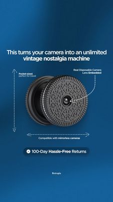 Questo template in formato Story è pensato per promuovere un accessorio fotografico compatto che regala alle mirrorless un look “usa e getta” dal gusto vintage. L’impostazione è pulita e molto mobile-first: sfondo blu in gradiente, prodotto in primo piano al centro con un close-up tecnico e tridimensionale, headline grande in bianco nella parte alta che comunica subito il beneficio (“trasforma la tua camera in una macchina della nostalgia”). Intorno al prodotto ci sono frecce tratteggiate e callout brevi che evidenziano tre punti chiave: dimensioni tascabili per il viaggio, lente integrata stile disposable e compatibilità con fotocamere mirrorless. In basso, un badge a pillola con “100‑Day Hassle‑Free Returns” funziona da rassicurazione e abbassa la barriera all’acquisto, perfetto per la fase di considerazione. A livello strategico combina nostalgia, curiosità e aspirazione: l’utente immagina subito scatti di viaggio più “iconici” e vuole capire l’effetto. Personalizzalo cambiando render, claim e callout (attacco, resa, filtri/effetti) oppure sostituendo il badge con garanzia, bundle o prova senza rischi.