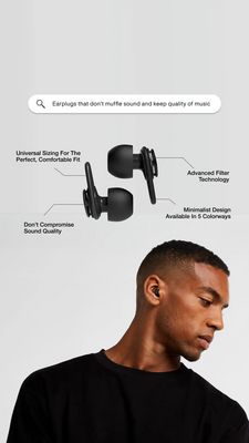 Questo template Story 9:16 è pensato per promuovere tappi auricolari hi‑fi che proteggono l’udito senza “impastare” la musica. In alto usa una barra di ricerca come headline (“Earplugs that don’t muff...