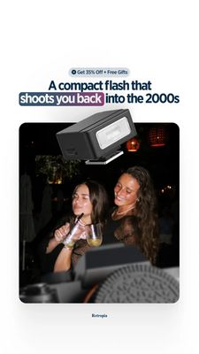 Questo visual funziona perché unisce chiarezza di prodotto (render del flash grande e ben leggibile) e promessa culturale (“ti riporta nei 2000”). La nostalgia è una scorciatoia emotiva: in un secondo l’utente capisce l’estetica che otterrà, anche se non stava cercando un accessorio del genere. La foto lifestyle in ambiente notturno fa da prova di contesto—serate, locali, scatti al buio—senza appesantire con specifiche tecniche, quindi è perfetta per un pubblico “unaware” in fase TOF. Spazi bianchi e tipografia bold garantiscono leggibilità su mobile; il micro-bollino con sconto e regali aggiunge un incentivo leggero ma efficace per trasformare curiosità in click. Best practice rispettate: un’idea forte, un hero product, un solo stimolo promozionale.