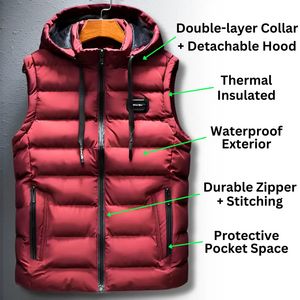 Questo template ad quadrato per il fashion valorizza un gilet piumino con cappuccio tramite un close-up pulitissimo del prodotto e una serie di callout tecnici. A sinistra domina il gilet rosso trapun...