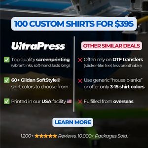 Questo template quadrato è pensato per promuovere un’offerta “bulk” di magliette personalizzate con stampa serigrafica, ideale quando vuoi difendere il valore della qualità senza perdere l’aggancio del prezzo. Il visual parte da una foto sfocata di macchinari di stampa come sfondo full‑bleed, con una barra arrotondata azzurra in alto che mette subito in evidenza l’offerta (“100 custom shirts for $395”). Il cuore del layout è un confronto a due colonne: a sinistra, con spunte verdi, i punti di forza del brand (serigrafia di livello, ampia scelta colori, produzione USA); a destra, con X rosse, i limiti tipici delle “offerte simili”. La linea verticale centrale e le intestazioni in grassetto rendono la lettura rapidissima, perfetta per chi scorre di fretta. In basso, stelle e numeri di recensioni/vendite aggiungono riprova sociale, mentre il pulsante “Learn More” accompagna l’utente nella fase di considerazione. Funziona perché abbassa il rischio percepito e trasforma la scelta in criteri chiari. Personalizza logo, prezzo, modello di maglietta e promesse di produzione/spedizione per adattarlo a diversi brand.