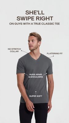Questo template in formato Story promuove una t-shirt uomo “classic tee” con un’impostazione pulita e minimalista che unisce lifestyle e spiegazione prodotto. Al centro c’è un modello a figura intera con una V‑neck color antracite su sfondo bianco sporco: contrasto alto, look premium e sensazione di essenzialità moderna. L’headline “She’ll swipe right…” usa un riferimento immediato al mondo dating app per catturare l’attenzione in fase di awareness (TOF), parlando anche a chi non conosce ancora il brand. Le annotazioni con puntini e linee guida evidenziano benefici concreti—colletto che non si allarga, vestibilità valorizzante, maniche e spalle aderenti, tessuto super morbido—trasformando la foto in una mini “scheda tecnica” leggibile in pochi secondi. La tipografia in maiuscolo, forte e centrata, dà autorità al messaggio, mentre i callout riducono dubbi su fit e comfort, tipici dell’acquisto online. Il template si personalizza facilmente cambiando modello, colore della maglia e claim, e aggiungendo logo e CTA nella parte bassa per campagne più performance.
