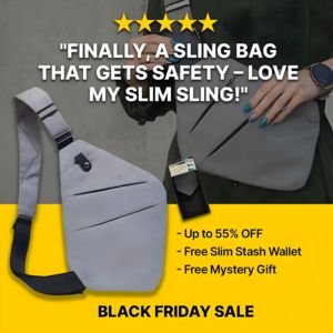 Questo template quadrato è pensato per promuovere una sling bag/borsa a tracolla slim da uso quotidiano, con un chiaro focus su praticità e sicurezza. Il design abbina una foto lifestyle ravvicinata (la borsa indossata e tenuta tra le mani) a un product shot pulito sulla sinistra: in un solo colpo d’occhio si capisce come veste e com’è fatta. In alto, 5 stelle gialle e un headline in maiuscolo stile “recensione” trasformano la riprova sociale nel messaggio principale, perfetto per utenti in fase di considerazione che conoscono già la soluzione ma vogliono conferme. Il contrasto tra grigi freddi e il pannello giallo intenso in basso guida lo sguardo verso l’offerta Black Friday, con benefit a elenco (fino al 55% di sconto + omaggio portafoglio slim + mystery gift) che attivano valore e convenienza. Tipografia sans-serif molto leggibile e ombre marcate assicurano performance nel feed. Personalizzabile cambiando quote, sconto e bundle omaggi, mantenendo la doppia immagine per evidenziare tasche, materiali o dettagli antifurto.
