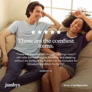 Questo template quadrato per il fashion è pensato per promuovere capi loungewear o sleepwear puntando tutto sulla sensazione di comfort “da casa”. La scena mostra due persone rilassate sul divano, illuminate da una luce calda che entra da una grande finestra: un contesto quotidiano e credibile che fa percepire subito morbidezza, praticità e benessere. In alto compaiono cinque stelle, poi un headline centrale grande (“These are the comfiest items.”) e, sotto, una recensione estesa con nome dell’autore: il layout funziona come una vera “scheda testimonianza” sovrapposta a una foto lifestyle. A livello strategico è perfetto per la fase di awareness: anche chi non sta cercando pigiami in quel momento capisce il vantaggio in un colpo d’occhio e si fida grazie a rating e citazione. La tipografia serif, elegante ma semplice, e il testo bianco ad alto contrasto rendono la lettura immediata senza risultare aggressiva. Il brand può sostituire facilmente recensione, nome, stelle e riga CTA (“Shop at…”) mantenendo la stessa gerarchia visiva per lanci, restock e collezioni stagionali.