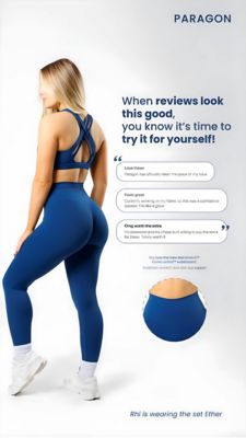 Questo template in formato 9:16 Story è pensato per promuovere un completo activewear coordinato (top sportivo + leggings a vita alta) puntando tutto sulla riprova sociale delle recensioni. A sinistra c’è una foto lifestyle a tutta altezza: la modella indossa un set blu navy che mette in evidenza vestibilità, taglio e resa sul corpo. A destra, un headline deciso (“When reviews look this good…”) introduce subito l’angolo “te lo consigliano gli altri”, mentre tre box arrotondati in stile card ricordano le recensioni delle app e rendono i commenti più credibili e “scansionabili”. Lo sfondo bianco pulito, con testo blu e ombre leggere, mantiene l’attenzione sul prodotto e sulle frasi chiave: perfetto per il top-of-funnel, quando l’utente è ancora inconsapevole e serve un motivo semplice per fermarsi. Funziona perché abbassa il rischio percepito: vedi l’outfit in uso e, nello stesso momento, leggi conferme rapide. Personalizzalo sostituendo brand e copy, inserendo vere recensioni e usando il cerchio in basso per il tuo dettaglio distintivo (cucitura scrunch, texture, fascia in vita).