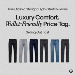 Questo template funziona nel mid-funnel (consideration) perché dà per acquisito che l’utente sappia già cosa sta guardando (jeans straight high-stretch) e sposta l’attenzione sui driver decisivi d’acquisto: comodità e convenienza. Il claim unisce un segnale premium (“Luxury Comfort”) a una promessa di prezzo accessibile (“Wallet‑Friendly Price Tag”), incorniciando il valore e abbassando il rischio percepito senza “svendere” il brand. La riga “Selling Out Fast” introduce la scarsità come trigger di urgenza moderata: accelera la scelta mantenendo un tono elegante. A livello visivo, la lineup di varianti è una forma di prova prodotto immediata: rende chiari i lavaggi disponibili, supporta il confronto e aumenta la pertinenza per chi sta valutando. Spaziatura ampia, contrasto alto e logo discreto rispettano le best practice di leggibilità e fiducia nel formato 1:1 in feed.