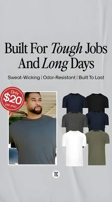 Questo template 9:16 in formato Story è pensato per promuovere t-shirt da lavoro uomo, presentate come capi essenziali affidabili per l’uso quotidiano. Il design punta su uno sfondo grigio chiaro pulito e su un headline serif d’impatto (“Built For Tough Jobs And Long Days”), con parole chiave in corsivo che rafforzano subito l’idea di resistenza e durata. La riga dei benefit—traspirante, anti-odore, fatta per durare—parla a un pubblico “solution-aware”: sa già cosa cerca in una maglietta tecnica, ma vuole motivi concreti per scegliere questo brand. Il layout abbina una foto lifestyle con modello a sinistra e, a destra, una griglia ordinata di colori disponibili: fit reale + varietà in un colpo d’occhio, così diminuiscono i dubbi prima dell’acquisto. Il badge rosso con il prezzo (“Only $20 per shirt”) spinge la leva del valore e crea urgenza senza appesantire. Funziona bene in TOF perché comunica la promessa in pochi secondi e usa un prezzo ad alto contrasto per fermare lo scroll. Personalizza sostituendo il modello con un lavoratore del tuo settore, aggiornando la palette colori e inserendo logo e CTA in basso.
