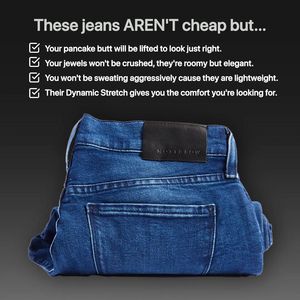 Questo template quadrato per moda è pensato per vendere jeans in denim stretch di fascia premium, affrontando subito l’obiezione più comune: il prezzo. L’headline forte (“These jeans AREN'T cheap but…...