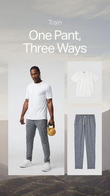 Questo template Story 9:16 è pensato per promuovere athleisure da uomo, in particolare un pantalone training “jolly” da abbinare in più contesti. Il titolo “Train / One Pant, Three Ways” è grande, cen...