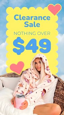 Questo template funziona perché mette in primo piano una proposta di valore facilissima: una soglia prezzo netta. Su un pubblico “unaware” in TOF, “Nothing over $49” abbatte l’attrito decisionale: non serve capire percentuali, né confrontare mille articoli. Il “$49” enorme è un gancio visivo perfetto per la velocità di lettura delle Stories. L’immagine lifestyle (hoodie blanket, posa rilassata, colori morbidi) crea desiderio e fa capire subito la categoria, attivando il trigger del comfort. I cuori rosa aggiungono un tono “coccolati” che rende la promo più aspirazionale e meno “da svendita”. In ottica best practice, la creatività unisce gerarchia ad alto contrasto, testo minimo e un’unica promessa memorabile: ottima per reach ampio e click rapidi con CTA Shop Now.