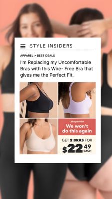 Questo template in formato Story 9:16 è pensato per pubblicizzare reggiseni senza ferretto puntando su comfort e convenienza. La creatività riprende l’estetica di un articolo “editoriale” (“Style Insiders”), sfruttando l’effetto autorevolezza tipico della fase di considerazione: sembra un consiglio selezionato, non una pubblicità aggressiva. Il titolo grande in nero è scritto in prima persona (“Sto sostituendo i miei reggiseni scomodi…”), agganciando subito il pain point di fastidio, prurito e sostegno insufficiente. Sotto, una griglia 2x2 mostra primi piani della vestibilità in vari colori, utile per valutare coprenza, scollo e posizione delle spalline. Il riquadro corallo con la frase di urgenza e il blocco prezzo enorme (“2 reggiseni…”) rendono l’offerta immediata e facilmente scansionabile. La palette neutra con accenti caldi mantiene un feeling pulito e “premium accessibile”. Ogni brand può sostituire testata, claim e prezzo bundle, mantenendo la gerarchia visiva forte dell’area promo.