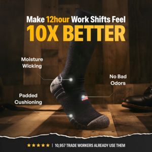 Questo template quadrato in stile workwear è pensato per vendere calze tecniche da lavoro pensate per turni lunghi. L’immagine principale mostra un piede con calza su un pavimento in legno da officina, con stivali robusti sullo sfondo: un contesto “da cantiere” immediato che parla a chi fa mestieri manuali. Il titolo ad alto contrasto, in bianco e giallo “segnaletico”, spinge una promessa forte (“10X BETTER”) e aggancia il problema reale dei turni da 12 ore. Le linee con puntatori evidenziano tre benefici chiave, facili da capire al primo sguardo: traspirazione/anti-umidità, imbottitura, e niente cattivi odori. In basso, stelline e una frase di riprova sociale (“10.957…”) aumentano credibilità e riducono lo scetticismo. La palette calda e l’illuminazione “gritty” comunicano resistenza e praticità: perfetto per awareness (TOF) su pubblico poco consapevole, perché parte dal dolore quotidiano e lo trasforma in un vantaggio desiderabile. È semplice da personalizzare cambiando claim, numeri, callout e colore prodotto, mantenendo il giallo come accento ad alta visibilità.
