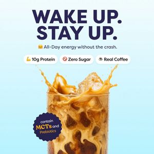 Questo template quadrato è pensato per promuovere un iced coffee ready-to-drink che punta su energia “pulita” e duratura. Lo sfondo azzurro chiaro, pieno e luminoso, crea un look fresco e moderno, mentre il titolo in maiuscolo, grande e bold in blu navy (“WAKE UP. STAY UP.”) cattura subito l’attenzione. La riga di supporto (“All-day energy without the crash”) traduce il beneficio in modo immediato: perfetto per la fase TOF, quando il pubblico è ancora “unaware” ma conosce bene il calo di energia di metà mattina o pomeriggio. Tre pill badge ordinati (10g protein, zero sugar, real coffee) trasformano le claim in micro-argomentazioni facili da memorizzare. In basso domina l’immagine hero: un bicchiere di caffè freddo con ghiaccio e splash, che attiva craving e desiderio di freschezza. Il bollino scuro a bordo ondulato evidenzia MCT e prebiotici, aggiungendo curiosità. È facile da personalizzare sostituendo foto, claim e “seal” ingrediente mantenendo la stessa gerarchia di lettura.