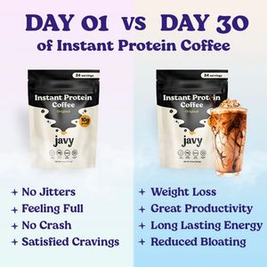 Questo template quadrato è pensato per promuovere un caffè proteico istantaneo (o un drink mix in busta) usando un confronto immediato “Giorno 01 vs Giorno 30”: vende un risultato percepito, non solo ...