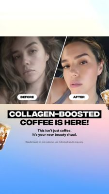 Questo template 9:16 in formato Story è pensato per promuovere un iced coffee “al collagene” presentato come rituale di bellezza dall’interno. In alto troviamo un collage selfie “Before/After” separat...